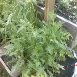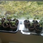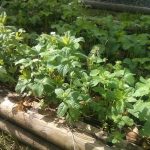 The strawberry plants in the garden continue to get more flowers, and we have some mint amongst the strawberries. Â The potato plants are getting bigger as well. Â The poppy flowers are starting too, with a few of our newly planted sunflowers sprouting next to them.